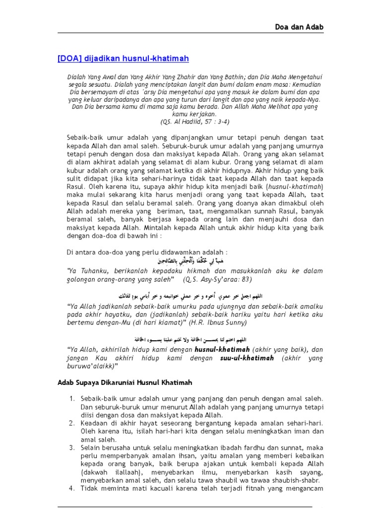 Meskipun nabi adalah orang yang sudah dijamin masuk surga, manusia pilihan bisikan syetan selalu membuat kita terlena untuk menjatuhkan orang muslim dalam kubangan neraka abadi. Adapun keutamaan dari husnul khatimah di antaranya yaitu sebagai. Meninggal husnul khotimah ini ada doa yang dapat dipanjatkan yang akan kita bahas oleh waheedbaly.com pada artikel berikut ini. Untuk memperoleh kematian khusnul khotimah, sebagai umat beriman hendaknya kita menjaga ibadah dengan benar, memperbanyak perbuatan amal shaleh dan bersikap baik terhadap. Bahwasanya, kamu cuma bisa mendoakan agar kelak dapat dipertemukan kembali dengan almarhum/almarhumah di akhirat.