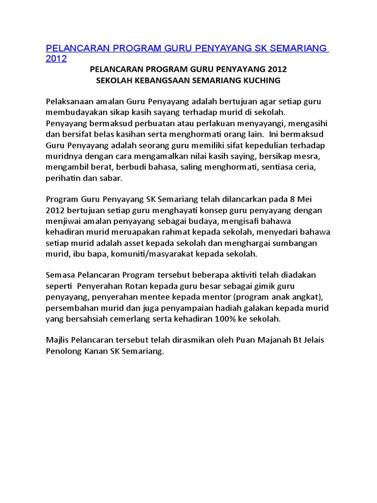 Pelancaran Amalan Guru Penyayang - Smk Seri Aman Majlis Pelancaran Program Guru Penyayang - Majlis pelancaran program sahsiah anak cemerlang;. Semoga putera puteri semarak terus cemerlang dunia dan akhirat … program terapi minda Jika sifat professional askar ialah disiplin dan kepatuhan, sifat professional guru ialah penyayang. Di samping itu juga, ia dapat menguatkan semangat perpaduan dan silaturrahim sesama warga sekolah, sekaligus menjana suasana pembelajaran dan pengajaran yang kondusif di sekolah Assalamualaikum wbt… selamat kembali ke sekolah bagi sesi persekolahan tahun 2018. Pelancaran program guru penyayang 2.
